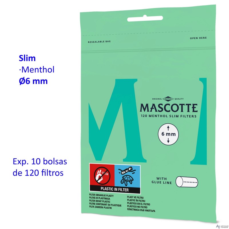 120 Filtros Mascotte Slim 6 mm Menthol Expositor con 10 bolsas