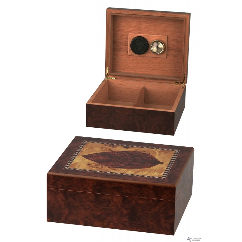 Humidor con higrómetro y humidificador magnéticos Hoja acabado taraceado