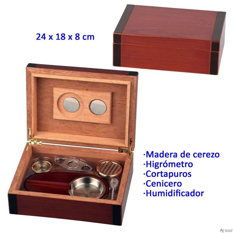 Humidor en madera de cerezo con higrómetro, cortapuros, cenicero y...