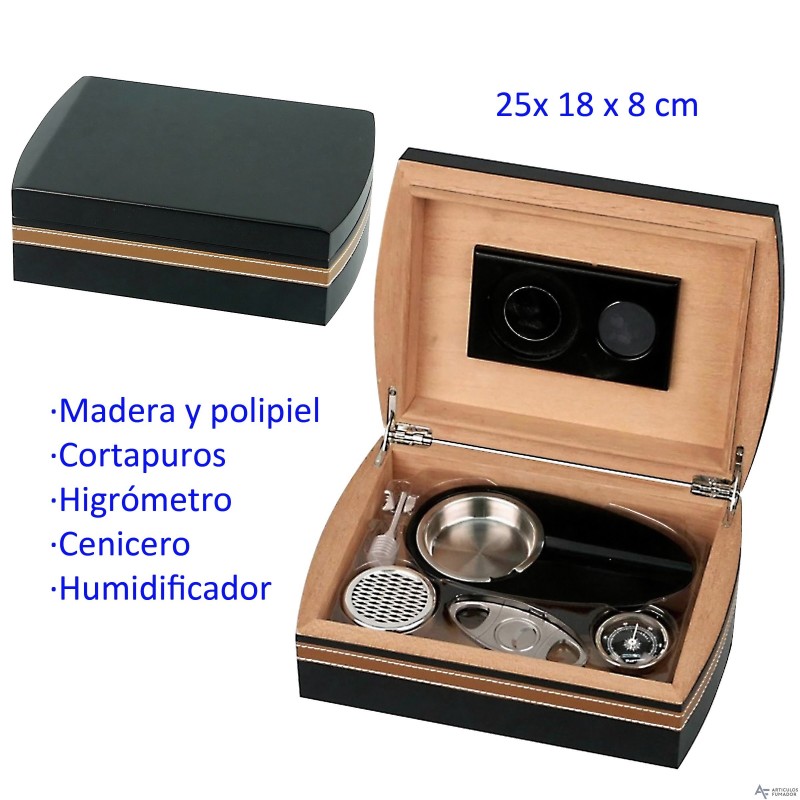 Humidor polipiel negro/marrón con higrómetro, cortapuros, cenicero y...