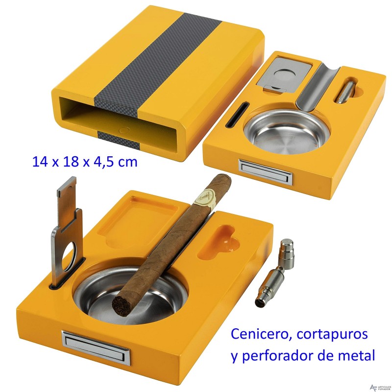 Set de cigarros amarillo/carbono con cenicero, cortapuros y perforador 14...