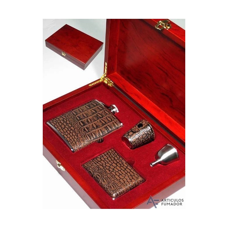 Set de licorera 6 ozs. con tres accesorios. En estuche de madera