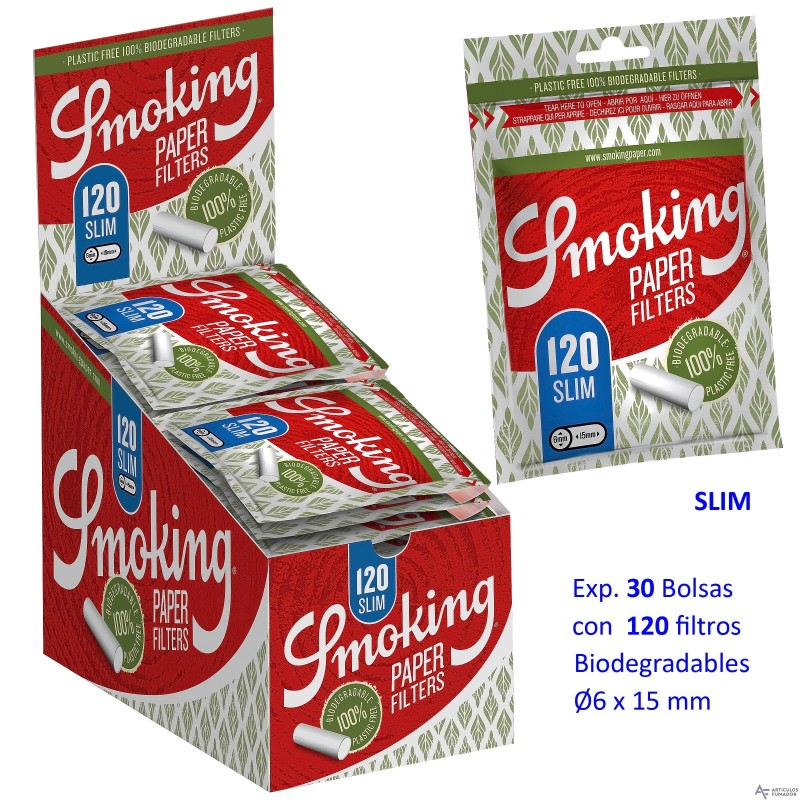 Smoking Slim paper filters 6x15 mm. Expositor con 30 bolsas de 120